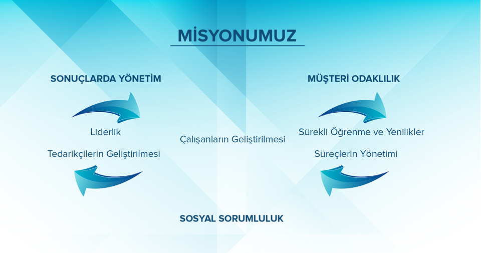 Bilgi ve tecrübesini, kullandığı ileri teknoloji ve Ar-Ge çalışmalarıyla birleştiren ve değişen dünya şartlarında kurumsal kimliğini, imalatını yaptığı ürünlerde farkındalık yaratarak kendi sektöründe, kalitesiyle teknoloji ve yaşam alanlarınızda güveni değerli müşterilerine sunabilmek,